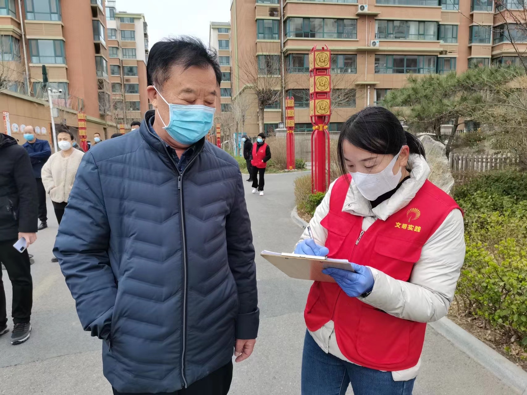 巾帼志愿者在惠民县孙武街道花千墅小区认真登记住户信息